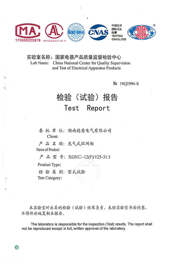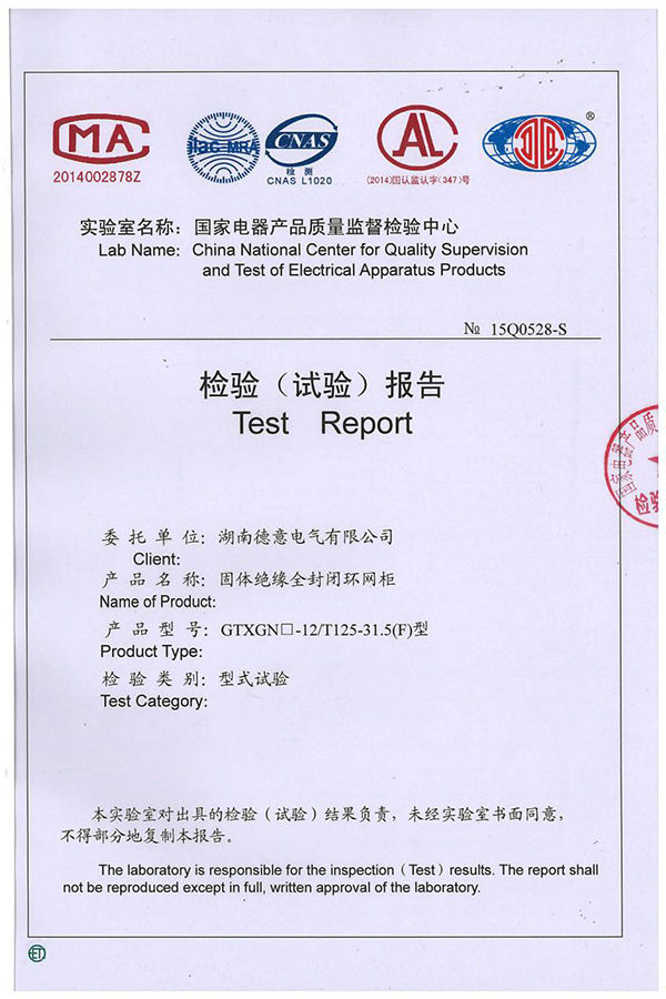 GTXGN□-12/T125-31.5(F)固體絕緣全封閉環(huán)網(wǎng)柜試驗(yàn)報(bào)告
