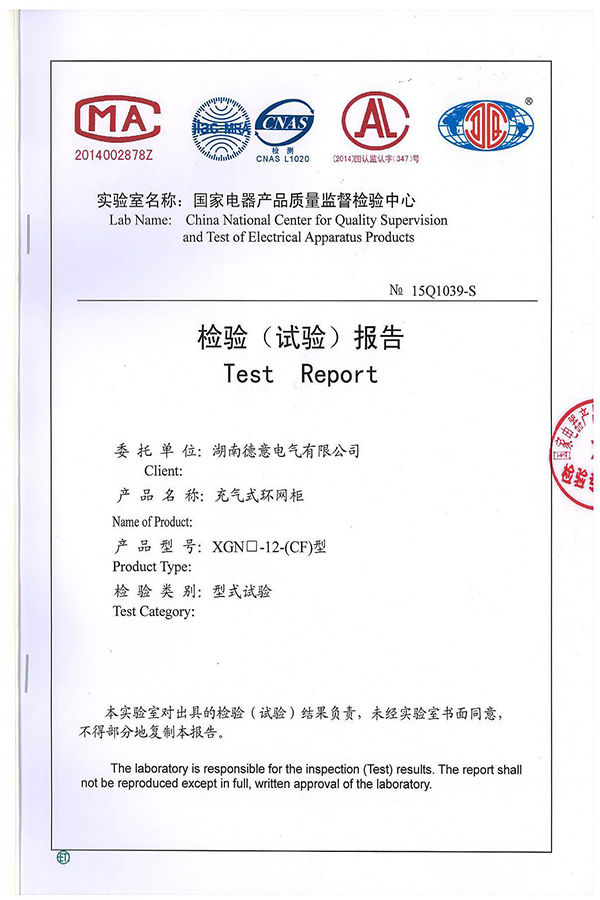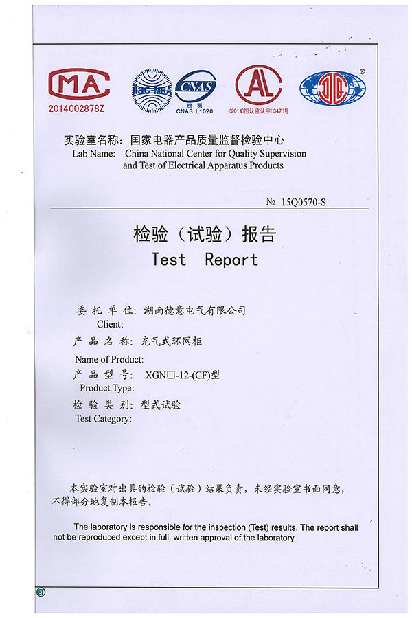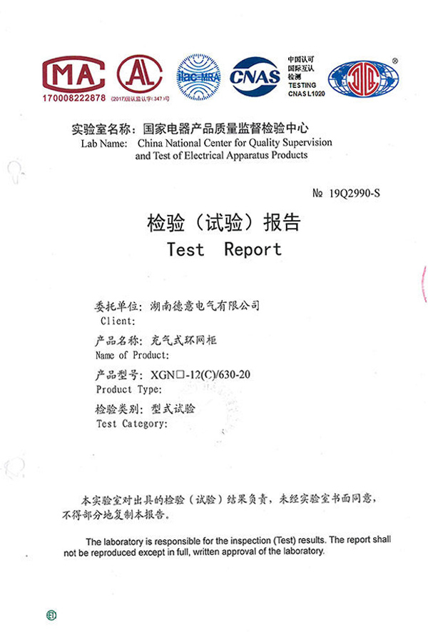 XGN□-12(C)/630-20型充氣式環(huán)網(wǎng)柜試驗(yàn)報(bào)告