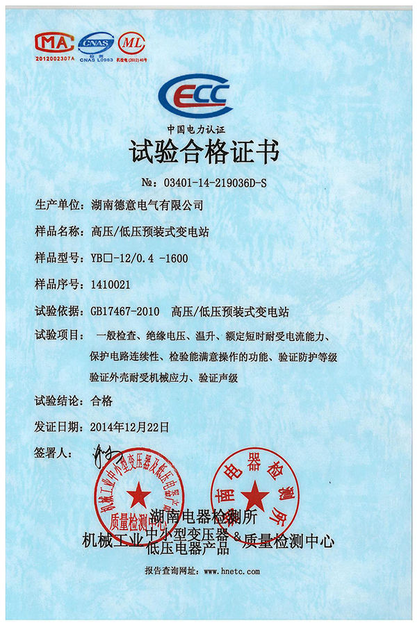 YB□-12/0.4-1600型箱式變試驗合格證書
