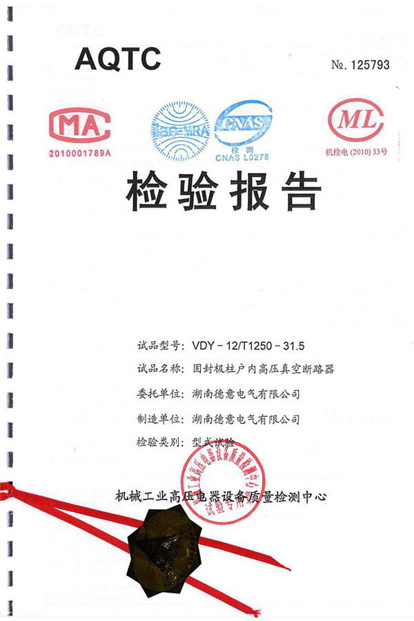 VDY-12/T1250-31.5固封極柱戶內(nèi)高壓真空斷路器試驗報告