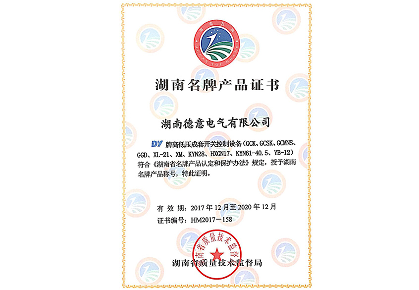 湖南省名牌產(chǎn)品證書